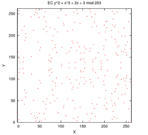 유한체에서 정의된 타원곡선은 곡선이 아니라 점들이 산재되어 있는 모습입니다. 이는 유한체의 원소들이 실수처럼 연속적이지 않기 때문에 나타난 결과입니다.