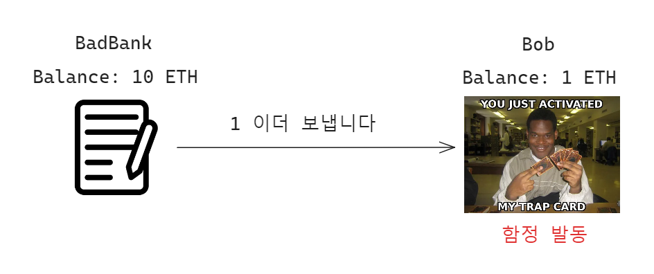 BadBank가 Bob에게 1 이더를 보내는 순간, 함정 카드가 발동합니다.