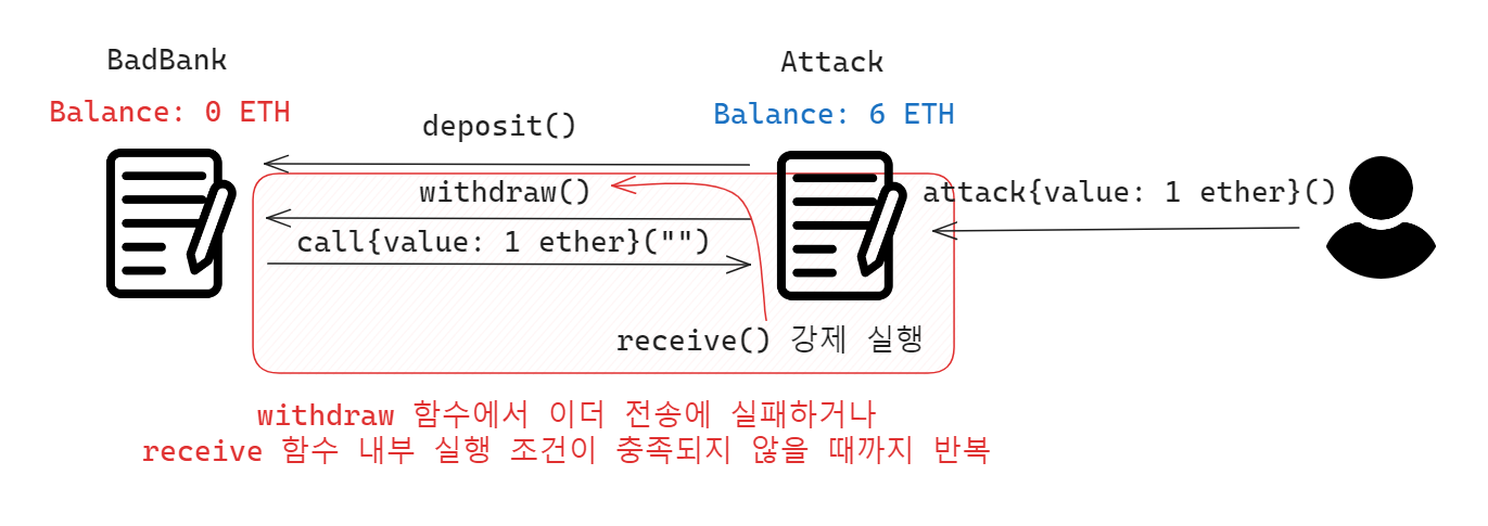 BadBank는 Attack에게 이더를 전송하고 다시 receive 함수가 호출되는 과정이 계속 반복되면서 결국 BadBank는 다른 사용자들이 입금한 이더까지 모조리 Attack에게 전송하는 불상사를 마주하게 됩니다.