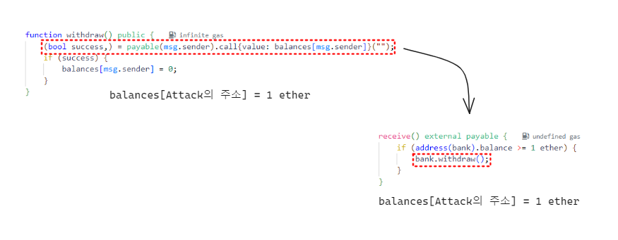 그리고 만약 BadBank의 잔액이 1 이더보다 많거나 같다면 다시 withdraw 함수를 호출하여 실행경로가 withdraw 함수로 재진입하게 됩니다.