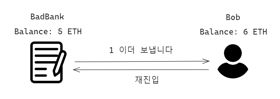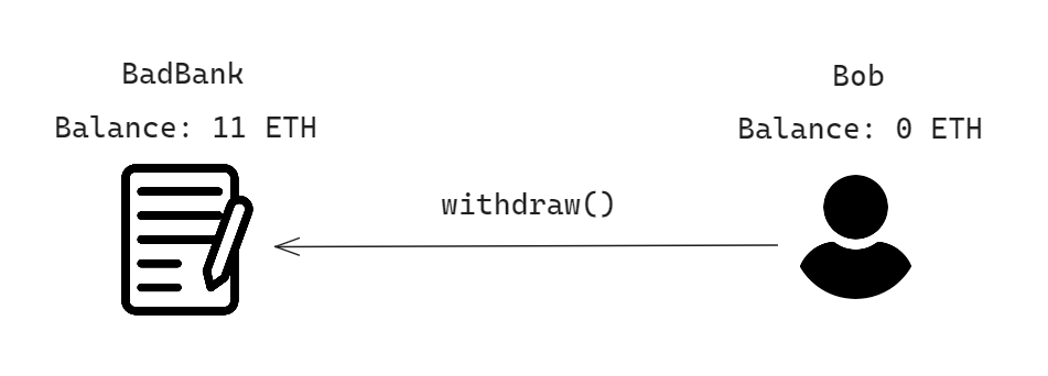 그런데 BadBank의 withdraw 함수에는 취약점이 존재합니다. 그리고 이를 오직 Bob만 눈치를 챘습니다. Bob은 공격을 감행하기로 마음먹습니다.