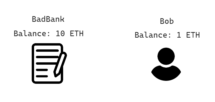BadBank 컨트랙트는 10 이더를 가지고 있고 Bob은 1 이더를 가지고 있습니다. BadBank가 가진 10 이더는 다른 사용자 또는 스마트 컨트랙트가 입금해 놓은 금액입니다. BadBank는 이를 안전하게 지켜야만 하고 소유주의 인출 요청에만 응답을 해야 되겠죠.