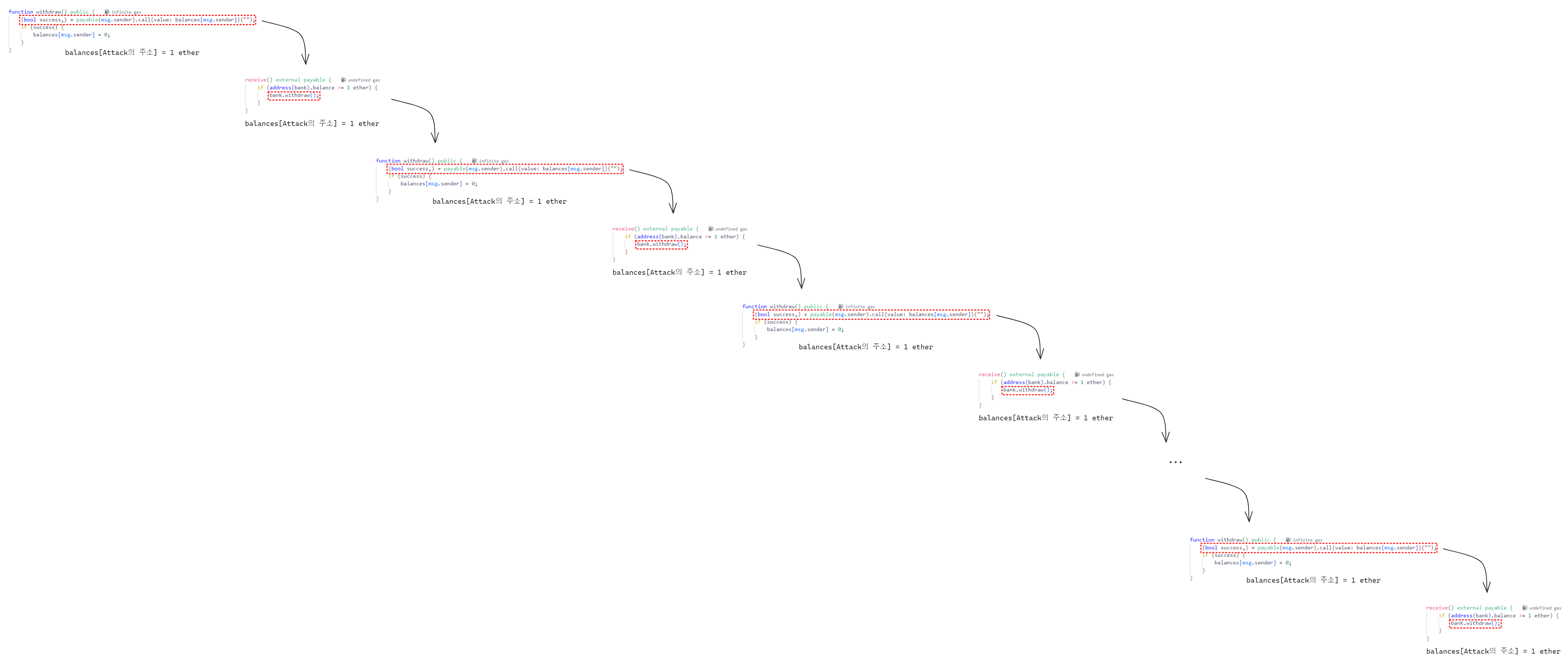 withdraw 함수가 호출되면 Attack 컨트랙트의 잔액인 1 이더가 Attack 컨트랙트로 전송되고 이더를 받은 Attack 컨트랙트는 receive 함수를 실행합니다. 이 과정이 재진입이 종료될 때까지 계속 반복됩니다.