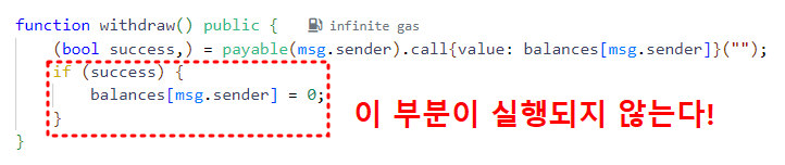 어떻게 이런 일이 가능한 걸까요? 앞에서 훑고 지나갔던 BadBank 컨트랙트의 withdraw 함수를 다시 살펴보겠습니다.