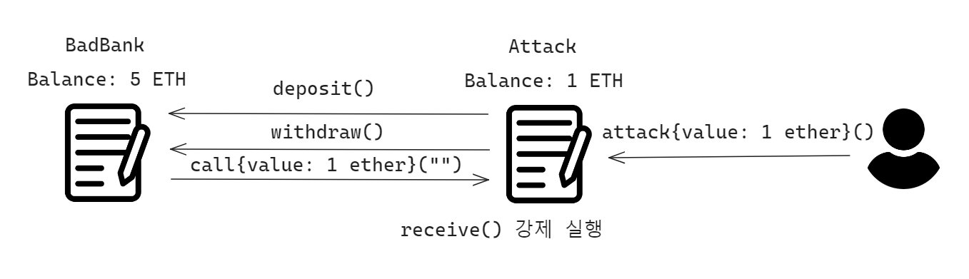 Bob은 BadBank의 withdraw 함수가 가진 취약점을 공격하는 로직을 실행하여 withdraw 함수에 반복적으로 재진입합니다. 이 과정에서 BadBank는 Bob이 입금한 1 이더를 돌려주는 로직을 반복해서 실행하게 되고